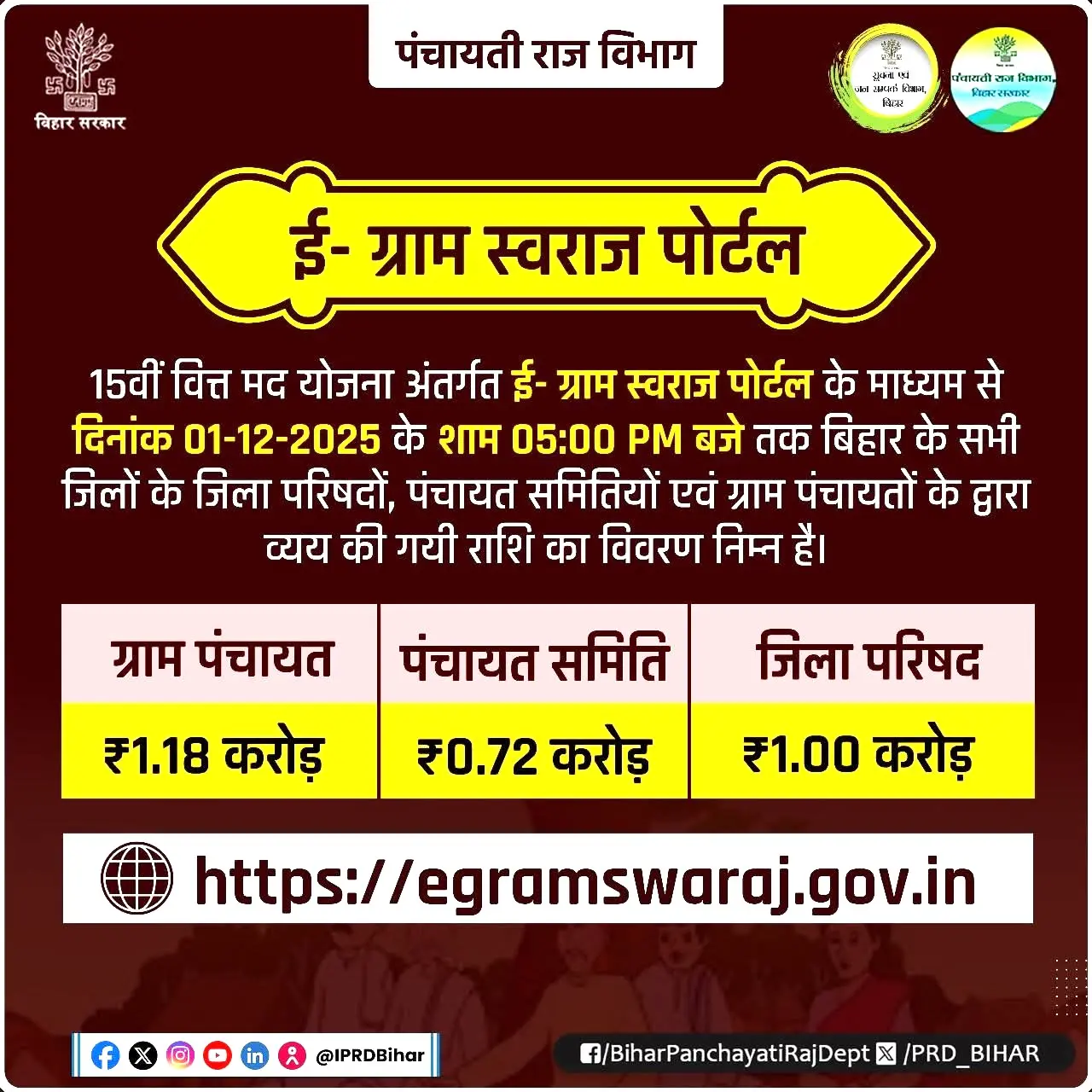 पंचायती राज विभाग, बिहार सरकार के अनुसार, 15वें वित्त आयोग योजना के अंतर्गत ई-ग्राम स्वराज पोर्टल के माध्यम से 01-12-2025 की शाम 05:00 PM बजे तक बिहार के सभी जिलों की पंचायती राज संस्थाओं (जिला परिषदों, पंचायत समितियों एवं ग्राम पंचायतों) द्वारा खर्च की गई राशि का विवरण जारी किया गया है।