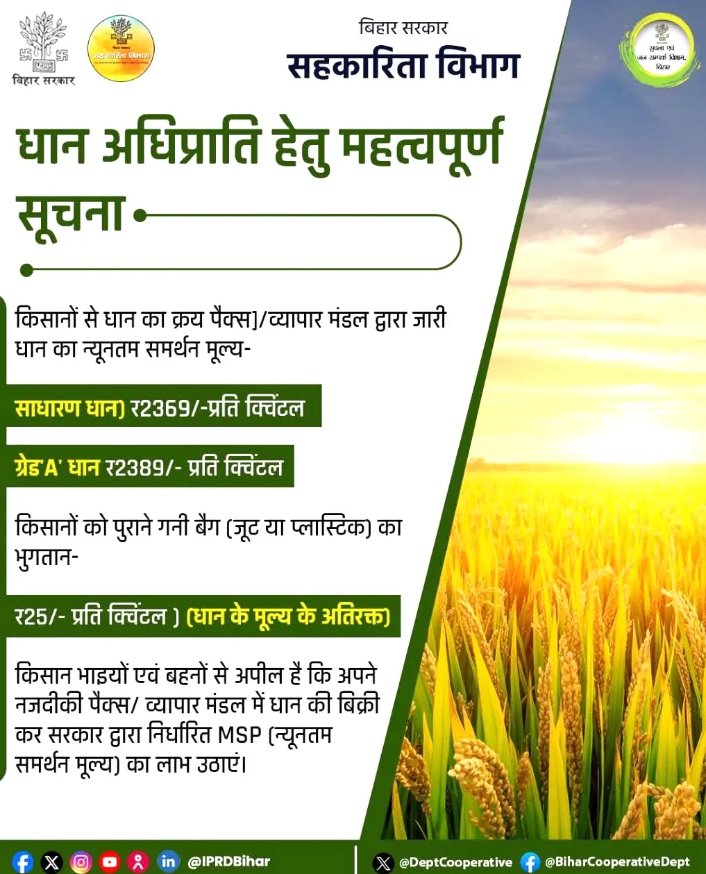 सहकारिता विभाग, बिहार सरकार ने किसानों के लिए धान अधिप्राप्ति (खरीद) हेतु न्यूनतम समर्थन मूल्य (MSP) की घोषणा की है।