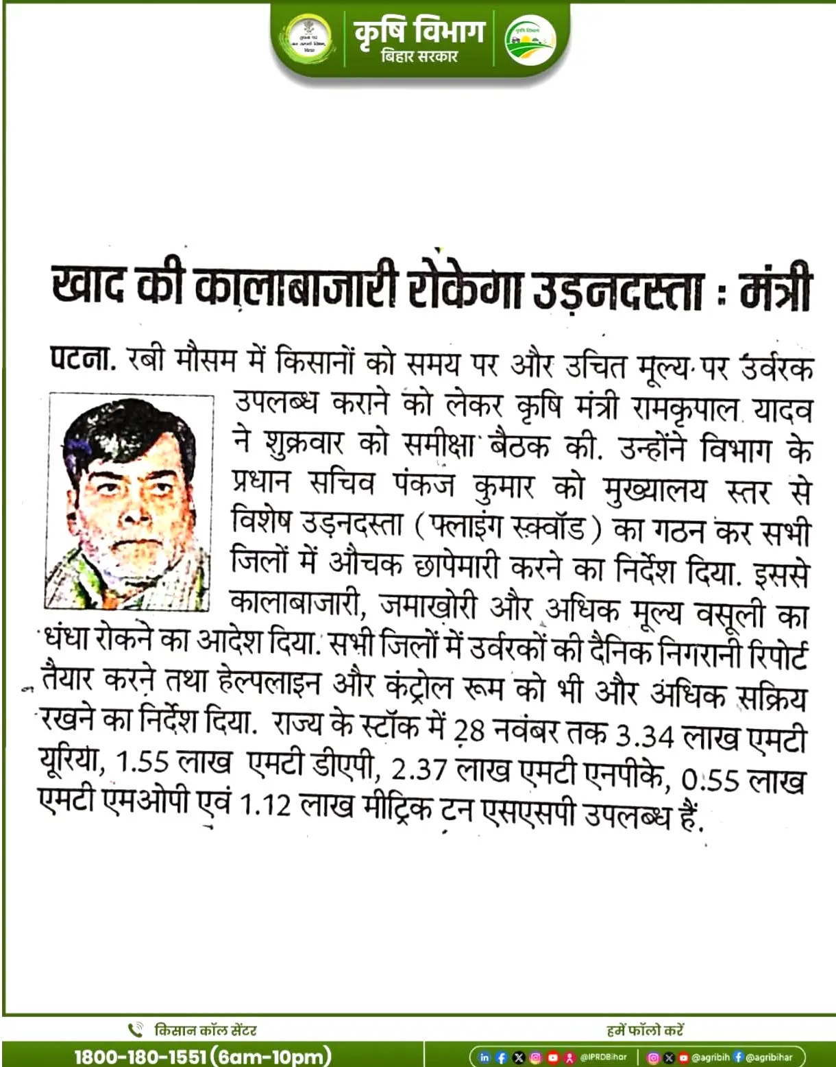 कृषि मंत्री रामकृपाल यादव ने घोषणा की है कि रबी मौसम में किसानों को समय पर और उचित मूल्य पर उर्वरक उपलब्ध कराने के लिए फ्लाइंग स्क्वॉड (उड़नदस्ता) का गठन किया गया है। मंत्री ने शुक्रवार को एक समीक्षा बैठक के बाद विभाग के प्रधान सचिव पंकज कुमार को मुख्यालय स्तर से विशेष उड़नदस्ता (फ्लाइंग स्क्वॉड) का गठन कर सभी जिलों में अचानक छापेमारी करने का निर्देश दिया।