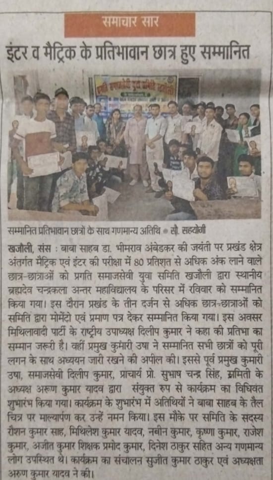 इसके अतिरिक्त 14 अप्रैल (डॉ. भीमराव अंबेडकर जयंती) पर मैट्रिक और इंटर में 400 से अधिक अंक लाने वाले विद्यार्थियों को प्रतिभा सम्मान समारोह के तहत पुरस्कृत किया जाता है। अब तक सैकड़ों विद्यार्थी इससे लाभान्वित हो चुके हैं।