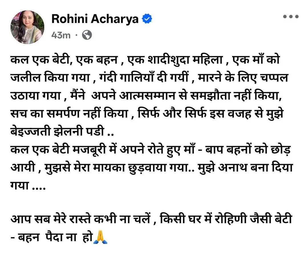 🔹 रोहिणी आचार्य का वर्तमान रुख और विरोधाभास