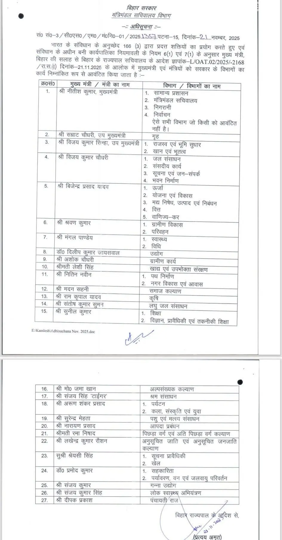 सूत्रों के अनुसार, विभागों के बंटवारे में विकास, शिक्षा, सड़क, स्वास्थ्य और गृह विभाग को प्राथमिकता दी गई है। भाजपा और जेडीयू दोनों दलों का संतुलन बनाए रखते हुए राजनीतिक संदेश भी साफ है—नई सरकार स्थिर और विकास-उन्मुख दिखाना चाहती है।