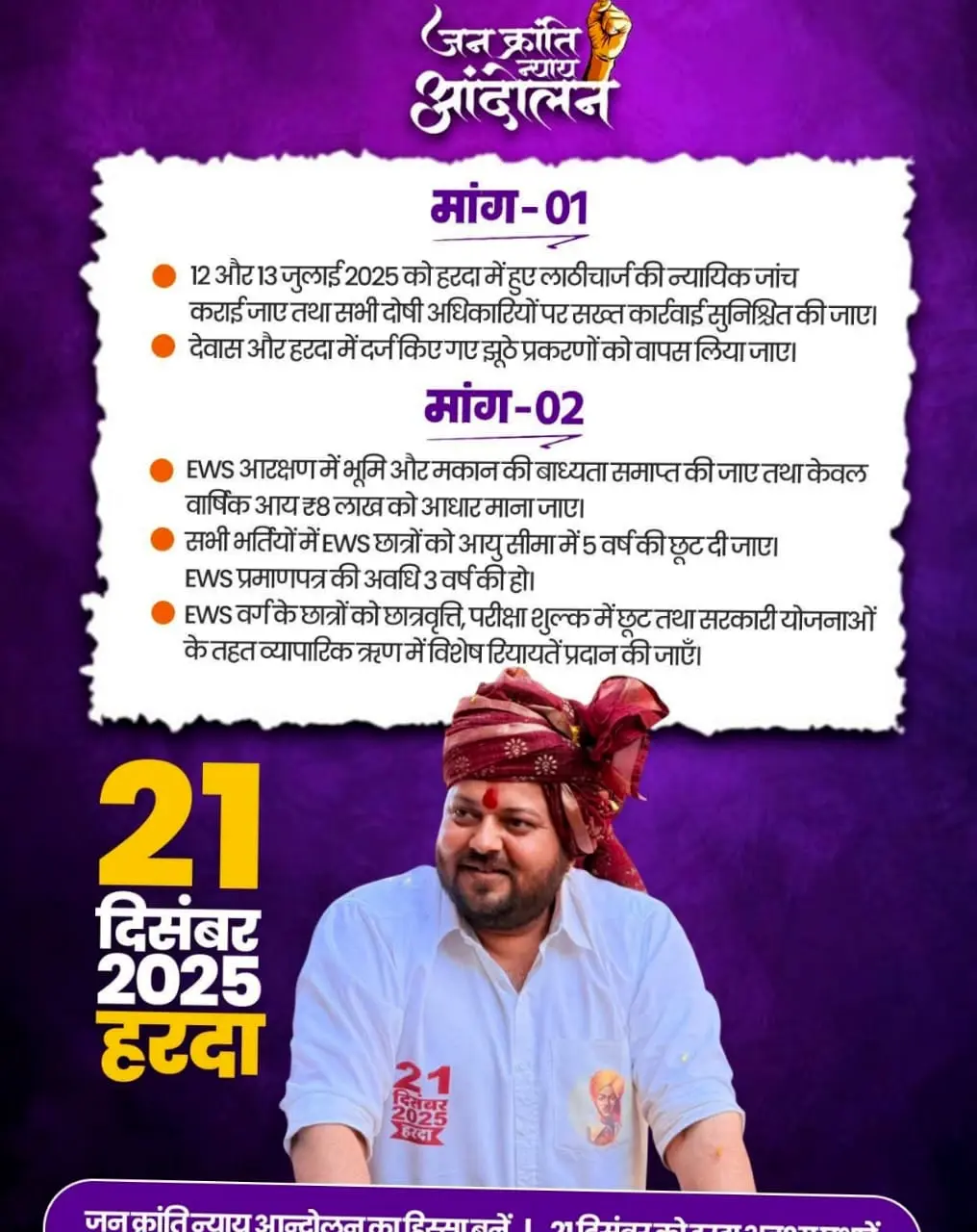 | जीवन सिंह शेरपुर | आरक्षण नीति पर सीधा हमला और चेतावनी। उन्होंने स्पष्ट किया कि सामान्य वर्ग के साथ हो रहे आर्थिक अन्याय को अब और बर्दाश्त नहीं किया जाएगा। | "हम अब 'माँग' नहीं, बल्कि अपना 'हक़' लेने आए हैं। आरक्षण जाति के आधार पर नहीं, रोटी के आधार पर होना चाहिए। अगर हमारी माँगें नहीं मानी गईं, तो यह आंदोलन हर राज्य में जंगल की आग की तरह फैलेगा।" |